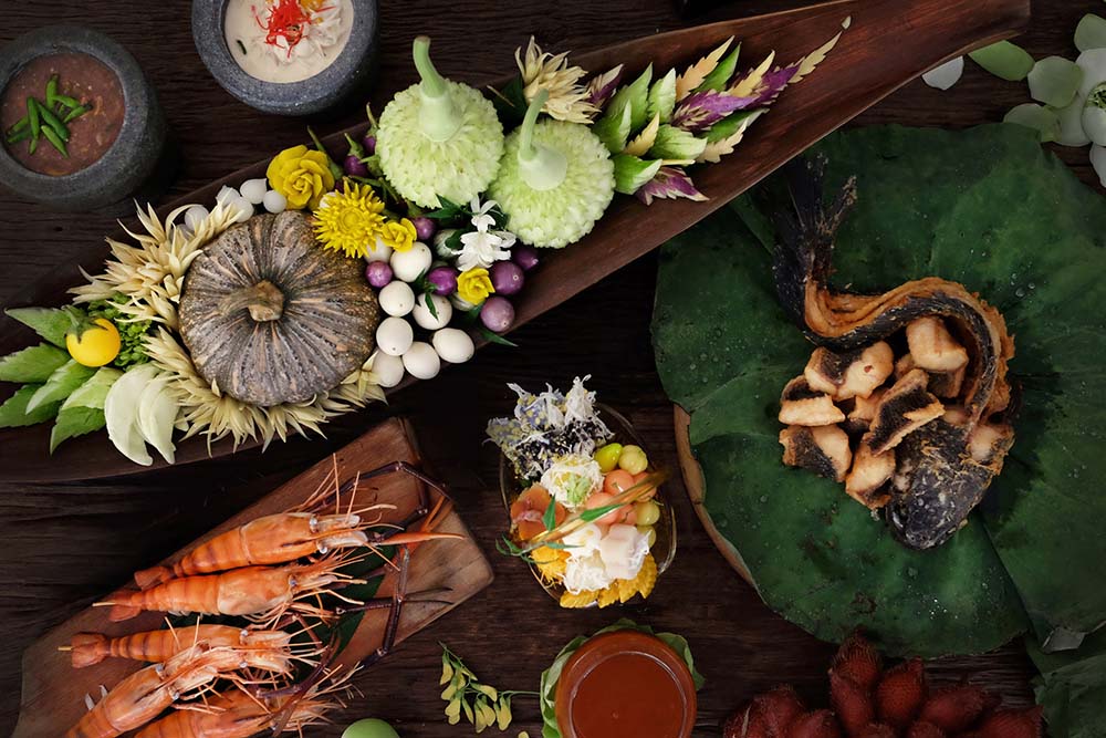 เพลิดเพลินไปกับหลากหลายสำรับคาว อาทิ แกงส้มผักรวมกุ้งแม่น้ำ เสริมอรรถรสด้วยการทานเคียงกับปลาช่อนแดดเดียว ต้มส้มปลากระบอก แกงเลียงกุ้งสด แกงเห็ดใบย่านาง พร้อมด้วย น้ำพริกโบราณต่างๆ เช่น น้ำพริกมะขามอ่อน น้ำพริกปู น้ำพริกระกำ น้ำพริกผัดหมู น้ำพริกกะปิ หลนกุ้งแม่น้ำ พิเศษ! ขนมจีนเส้นสด ซาวน้ำ น้ำพริก น้ำยาปลาแบบปักษ์ใต้แท้ๆ เสิร์ฟพร้อมสำรับเคียง ไม่ว่าจะเป็น ปลาแห้ง ไข่เค็ม รับประทานคู่กับ หลากหลายเครื่องเหมือด ผักสดพื้นบ้านและสมุนไพรไทยนานาชนิด ปิดด้วยฤดูฝนอันเลิศรสด้วย สำรับหวานสูตรโบราณ อาทิ ขนมดอกโสน ขนมโคน้ำ ฯลฯ
