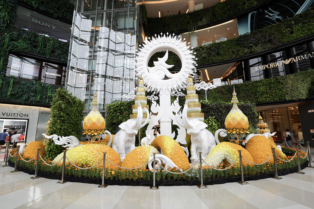 เพื่อน้อมรำลึกในพระมหากรุณาธิคุณ พระบาทสมเด็จพระปรมินทรมหาภูมิพลอดุลยเดช บรมนาถบพิตร และแสดงความอาลัยในวาระครบรอบ 1 ปีแห่งการสวรรคต บริษัท สยามพิวรรธน์ จำกัด ร่วมโครงการปลูกดอกดาวเรืองกับกองอำนวยการรักษาความมั่นคงภายในราชอาณาจักร(กอ.รมน.) สภากรุงเทพมหานคร และ สำนักงานตำรวจแห่งชาติ โดยเนรมิตทั้ง 3 ศูนย์การค้าด้วยดอกดาวเรืองสีเหลืองสะพรั่งทั้งพื้นที่ภายในและภายนอก และจัดแสดงประติมากรรมตามแนวคิด “จากน้ำ…สู่ฟ้า” ซึ่งได้แรงบันดาลใจจากพระราชกรณียกิจด้านการพัฒนาแหล่งน้ำ บริเวณโซนจีเวล ชั้น M ศูนย์การค้าสยามพารากอน